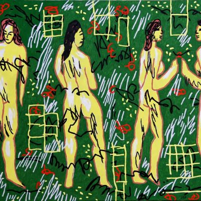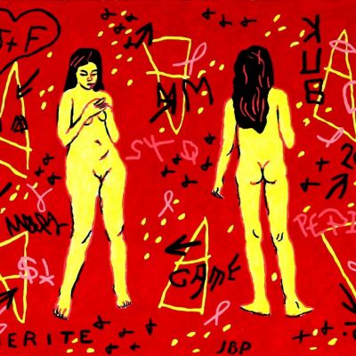 Quant au décor, peut-on encore parler de décor quand celui-ci vient s'imprimer jusque sur les figures elles-mêmes, au point que l'on arrive à une véritable confusion entre les figures et le fond ? Le décor de motifs, de signes et de tags peut évoquer un décor urbain bombé sur un mur de béton. On peut aussi le voir comme un motif millefleurs sortant d'une tapisserie médiévale, comme la Dame à la Licorne.