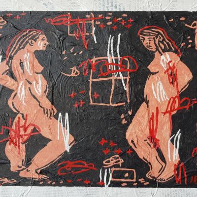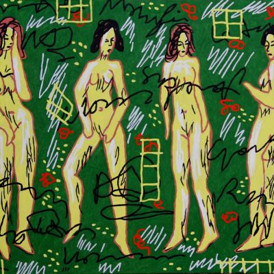 C'est en reprenant un de mes anciens thèmes et en le développant, que j'ai démarré cette nouvelle série, début 2017. Des suites de figures féminines sur fond vert (du moins au départ), ponctué de motifs et de signes. D'où le nom de Suites Vertes donné à cette série, même si, ultérieurement, j'ai utilisé des fonds de différentes couleurs.