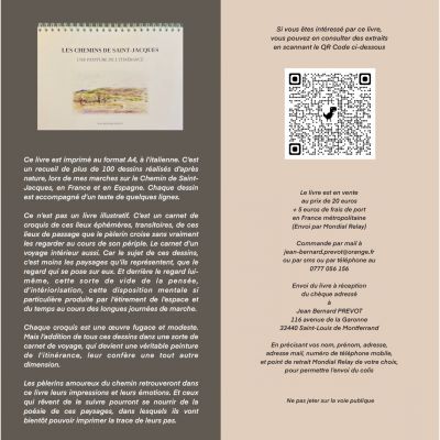 Mon livre sur les chemins de Saint-Jacques vient d'être édité (février 2024). Voir le flyer numérique ci-dessous. Il comporte un QR Code qui permet d'en parcourir quelques extraits, et indique la procédure à suivre pour se le procurer.
